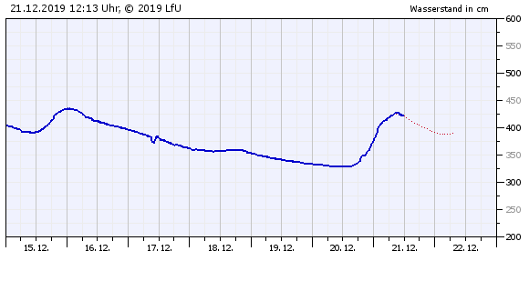 Für den heutigen Samstag ist trockenes Wetter vorhergesagt. Und abgesehen von Nebel ist es auch gar nicht so schlecht. Nur leider fordert der Regen der vergangenen Tage seinen Tribut: der Wasserpegel steigt. Die Grafik des Pegels Bad Kreuznach der Hochwasservorhersagezentrale Rheinland-Pfalz zeigt schön, wie der Pegel pünktlich heutigen Samstag steigt.