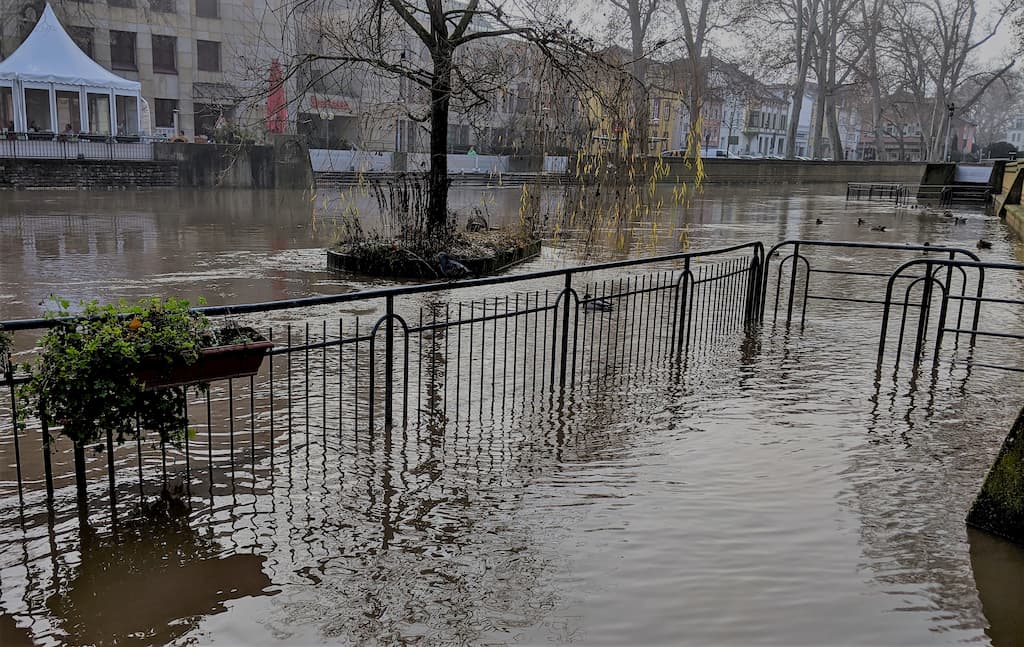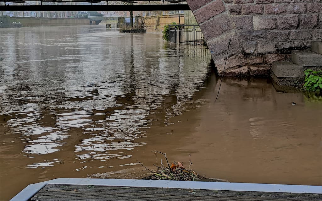 Um Missverständnisse zu vermeiden: das ist kein Hochwasser. Der Mühlenteich in Bad Kreuznach steigt schnell stark an, hält sich dann aber lange auf dem Niveau. Die Nahe hat jetzt einen Pegel von 4m. Ab 6m würde ich es Hochwasser nennen.