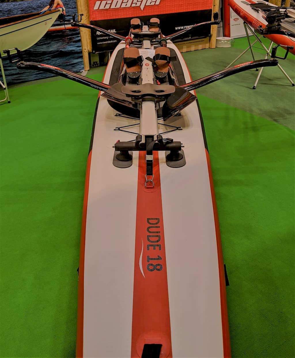 Die Konstruktion erinnert an ein Ergometer: Eine zentrale Rollschiene wird auf dem Board montiert. Diese trägt Sitz, Stemmbrett und Ausleger. Der Ausleger ist aus Carbon. Das Ganze gibt es als Einer und sogar als Zweier. Das »Kanu-Modell« wurde ebenso als »Hochzeits-Einer« ausgestellt - also als Einer mit Steuermann oder eher »Einer mit Kielschwein«. Ein Steuer habe ich nicht gesehen.