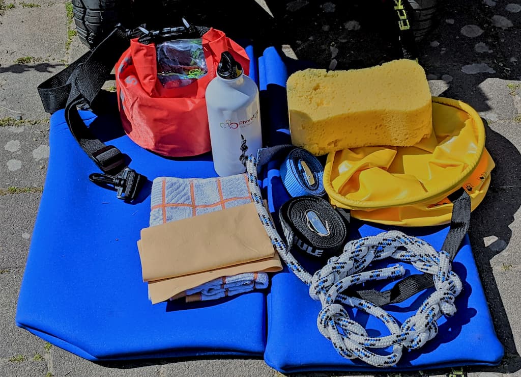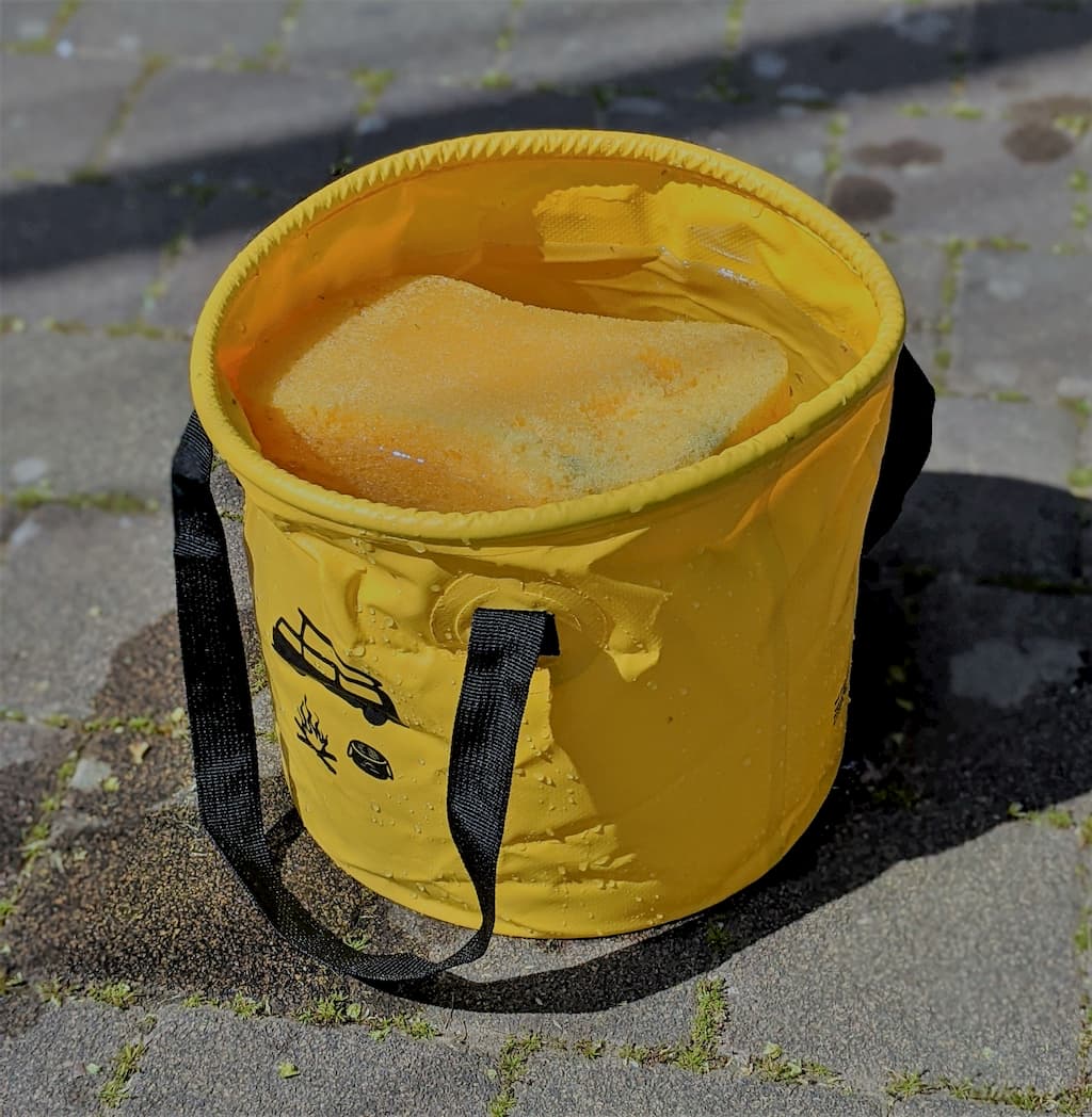 Und schließlich fehlt noch die Bootspflege nach der Fahrt. Dazu habe ich einen faltbaren Campingeimer dabei. Außerdem einen Schwamm, ein Fensterleder und einen Lappen.