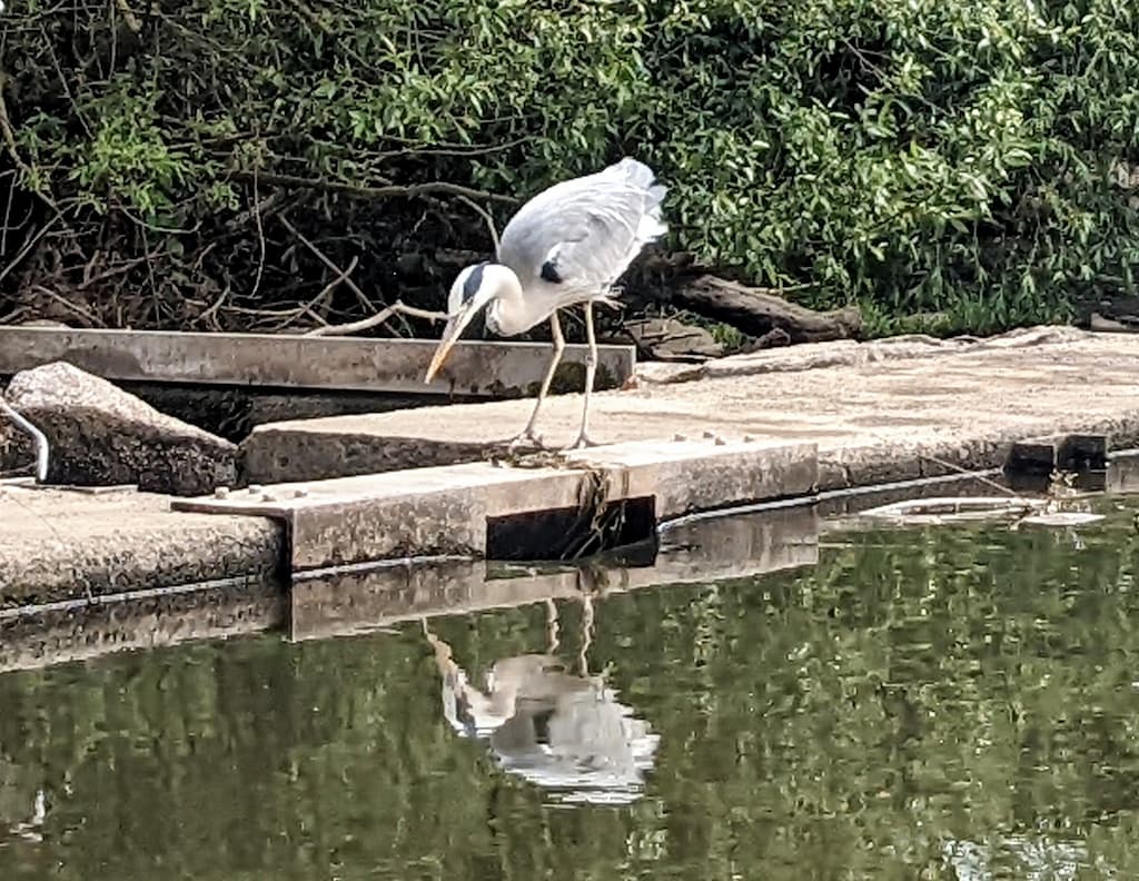 In letzter Zeit hat ein Graureiher die Fischtreppe für sich als Jagdrevier entdeckt. Graureiher sehe ich oft beim Rudern. Aber hier lässt er sich auch gut fotografieren.